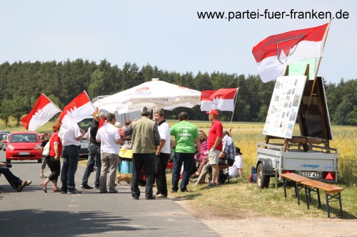 Am 02.06.2011 rief die Partei für Franken zur “Vatertags-Wanderung zum Drei-Franken-Stein” auf. Im Gasthof zur Krone traf man sich in Burghaslach (Landkreis Neustadt/Aisch-Bad Windsheim) zum gemeinsamen Mittagessen und zur Lagebesprechung. 47 Nichtmitglieder und Mitglieder, sowie einige Sympathisanten von der Internetplattform Facebook fanden sich zur Mittagszeit ein, sodass der Wirt kurzerhand den Gastraum für DIE FRANKEN freigab und die restlichen Gäste ins Nebenzimmer verlegen musste.